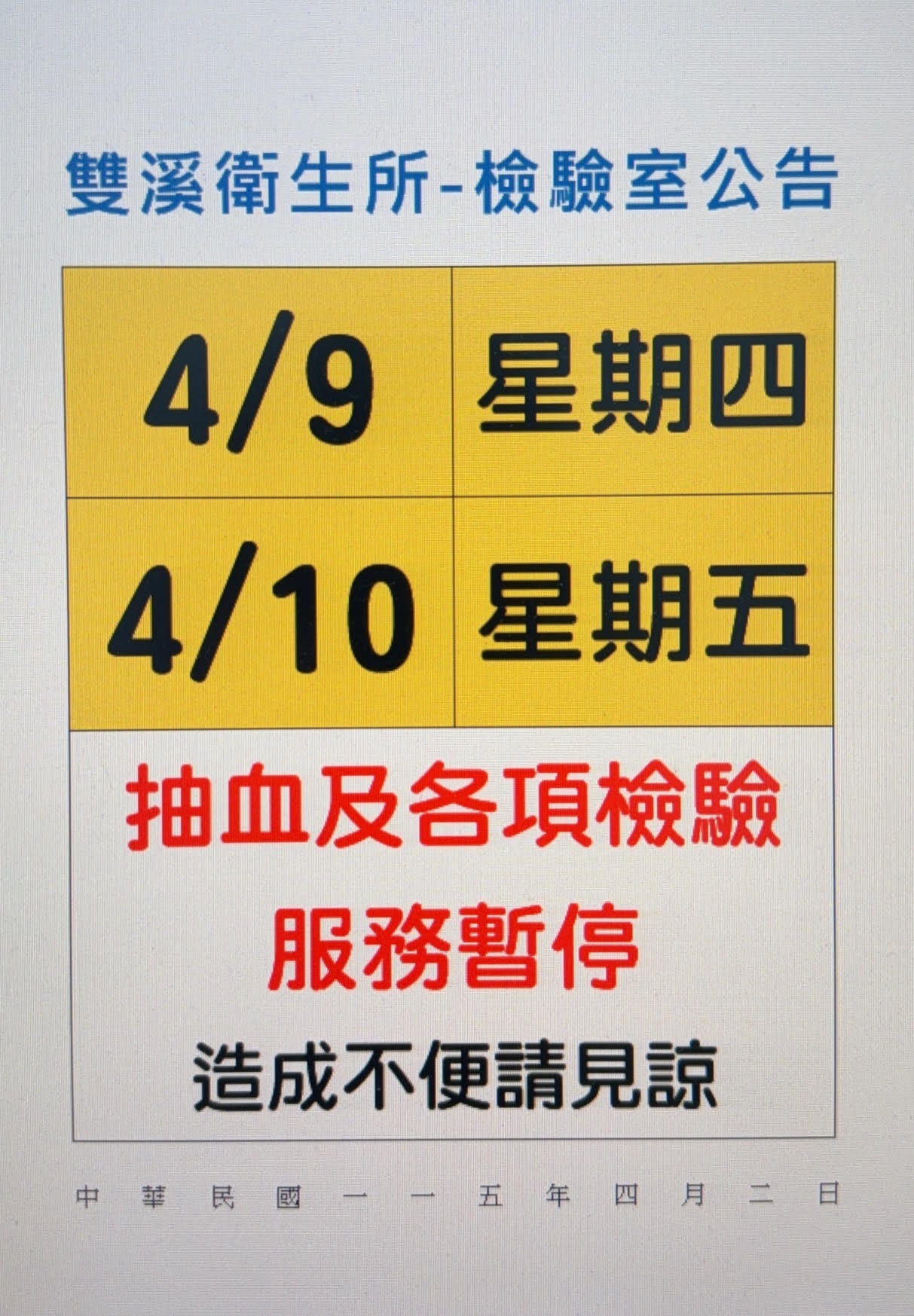 【公告】115年4月9日(W4)、4月10日(W5)抽血及各項檢驗暫停服務公告